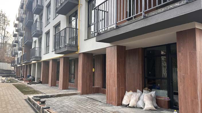 Зі східної сторони фасаду секцій № 13 та № 14 ЖК «Грінвуд-2» продовжуються роботи з оздоблення плиткою цокольного поверху. Наразі ці роботи виконано на 80%.