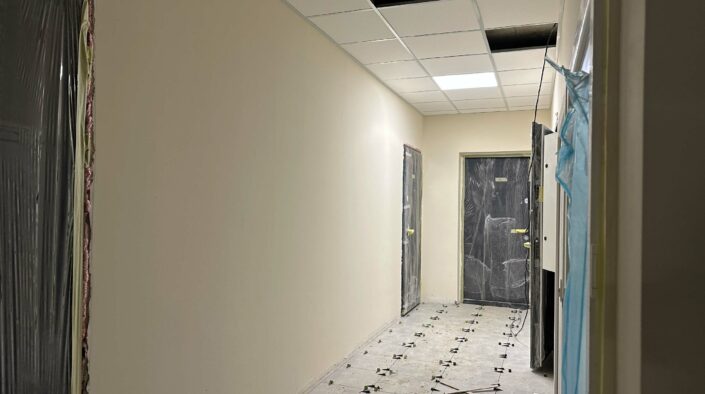 У секції № 4 ЖК «Грінвуд-4» триває фарбування стін в МЗК на всіх поверхах. Паралельно триває влаштування підвісної стелі “Армстронг” у МЗК на всіх поверхах