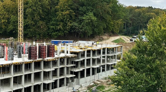 У секції № 21 ЖК «Грінвуд-2» завершено армування та бетонування вертикальний конструкцій 2-го поверху. Наразі триває монтаж опалубки на плиту перекриття 2-го поверху.