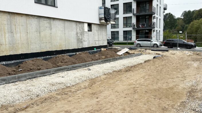 Біля секцій № 13 та № 14 ЖК «Грінвуд-2» розпочато роботи з влаштування благоустрою. Наразі триває монтаж бордюрів.