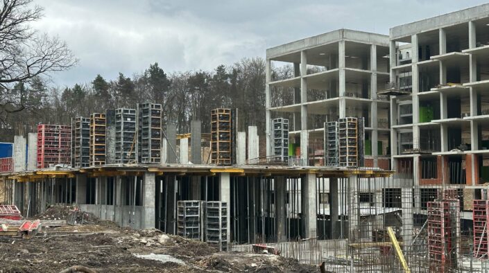 У секції № 22 ЖК «Грінвуд-2» завершили влаштування плити перекриття цокольного поверху. Наразі триває бетонування вертикальних конструкцій 1-го поверху.