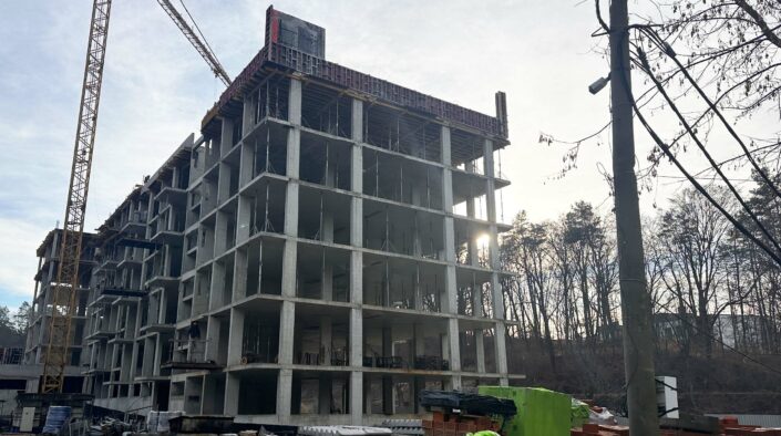 У секції № 20 ЖК «Грінвуд-2» завершено влаштування плити покриття 5-го поверху. Наразі триває армування парапету на покрівлі.