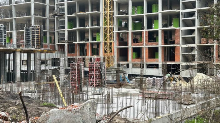У секції № 23 ЖК «Грінвуд-2» завершено армування та бетонування фундаментної плити. Наразі триває бетонування вертикальних конструкцій цоколя.