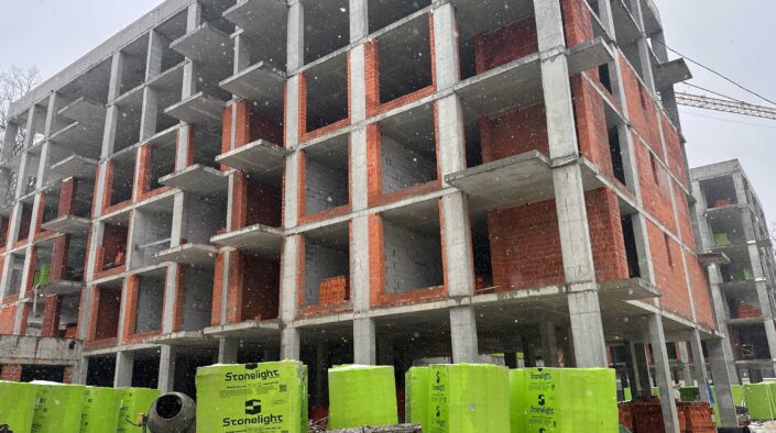 У секції № 11 ЖК «Грінвуд-3» завершено мурування зовнішніх стін на 1-му поверсі. Паралельно ці роботи тривають на 2-му – 3-му поверхах.