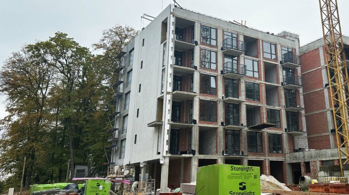 У секції № 9 ЖК «Грінвуд-3» завершено роботи з утеплення, армування та ґрунтування на торці фасаду. Наразі триває підготовка до декоративного оздоблення.