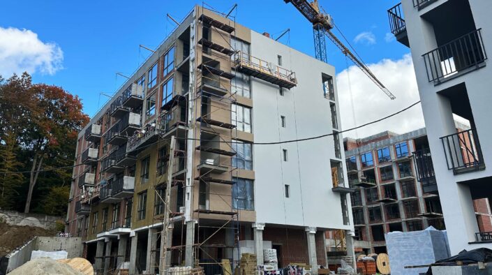 У секції № 9 ЖК «Грінвуд-3» триває декоративне оздоблення фасаду. Паралельно на іншій частина фасаду розпочато утеплення мінеральною ватою та пінополістиролом.