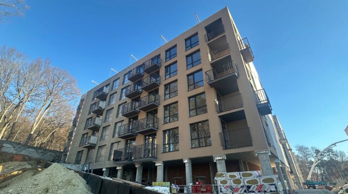 У секції № 9 ЖК «Грінвуд-3» завершено встановлення риштувань на торці з західної сторони будинку. Паралельно триває утеплення мінеральною ватою та пінополістиролом, а на іншій частині виконано армування та ґрунтування. Також виконано монтаж огороджувальних конструкцій на балконах.