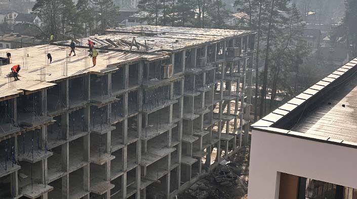 У секції № 5 ЖК «Грінвуд-3» завершено влаштування вертикальних конструкцій та монтаж опалубки на плиту покриття 5-го поверху. Наразі виконано армування плити покриття 5-го поверху та триває її бетонування.
