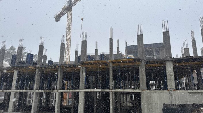 У секції № 8 ЖК «Грінвуд-3» завершено влаштування плити перекриття 1-го поверху. Наразі триває бетонування вертикальних конструкцій 2-го поверху.