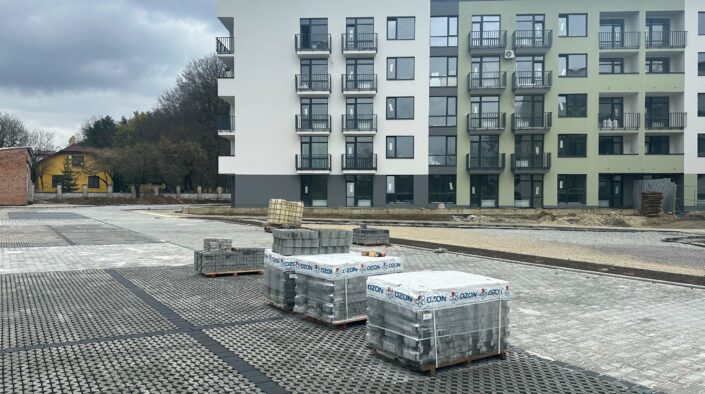 У ЖК «Грінвуд-4» триває мощення бруківки та монтаж бордюрів. Наразі завершено озеленення секцій № 1 – № 3.