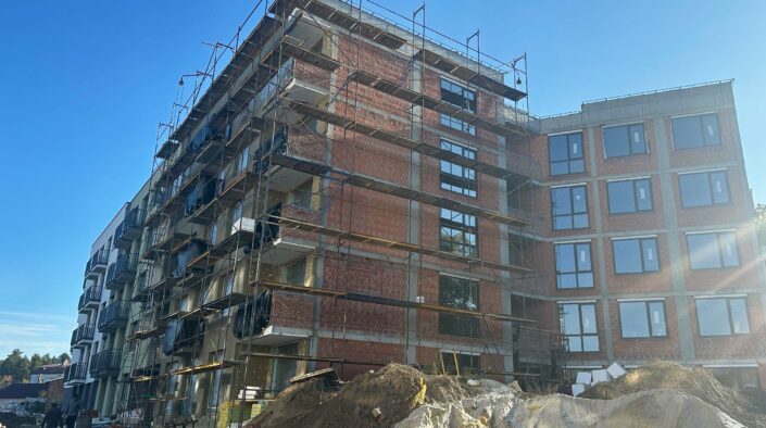 У секції № 5 ЖК «Грінвуд-4» тривають роботи з утеплення фасаду мінеральною ватою в комбінації з пінополістиролом. Паралельно на частині фасаду виконано армування.