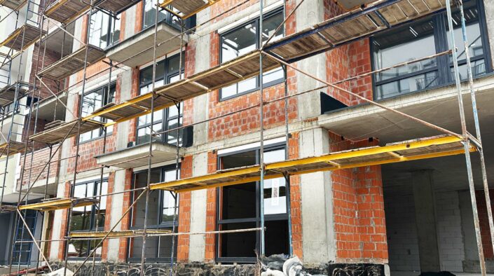 У секції № 5 ЖК «Грінвуд-4» триває влаштування віконних конструкцій на 1-му поверсі. Паралельно виконано штукатурення стін на 2-му – 5-му поверхах.
