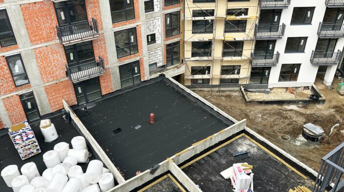 На покрівлі міжсекційного паркінгу секцій № 5 та № 6 ЖК «Грінвуд-4» триває влаштування гідроізоляції. Паралельно завершено монтаж вікон на 1-му поверсі у секції № 6.