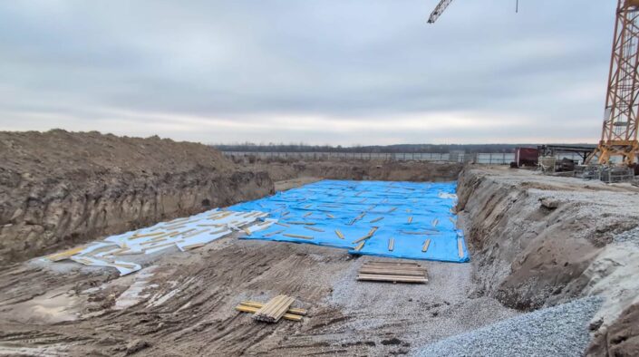У шостому будинку ЖК «Парксайд» продовжується влаштування котловану у секції № 1. Паралельно триває його щебеневе ущільнення.
